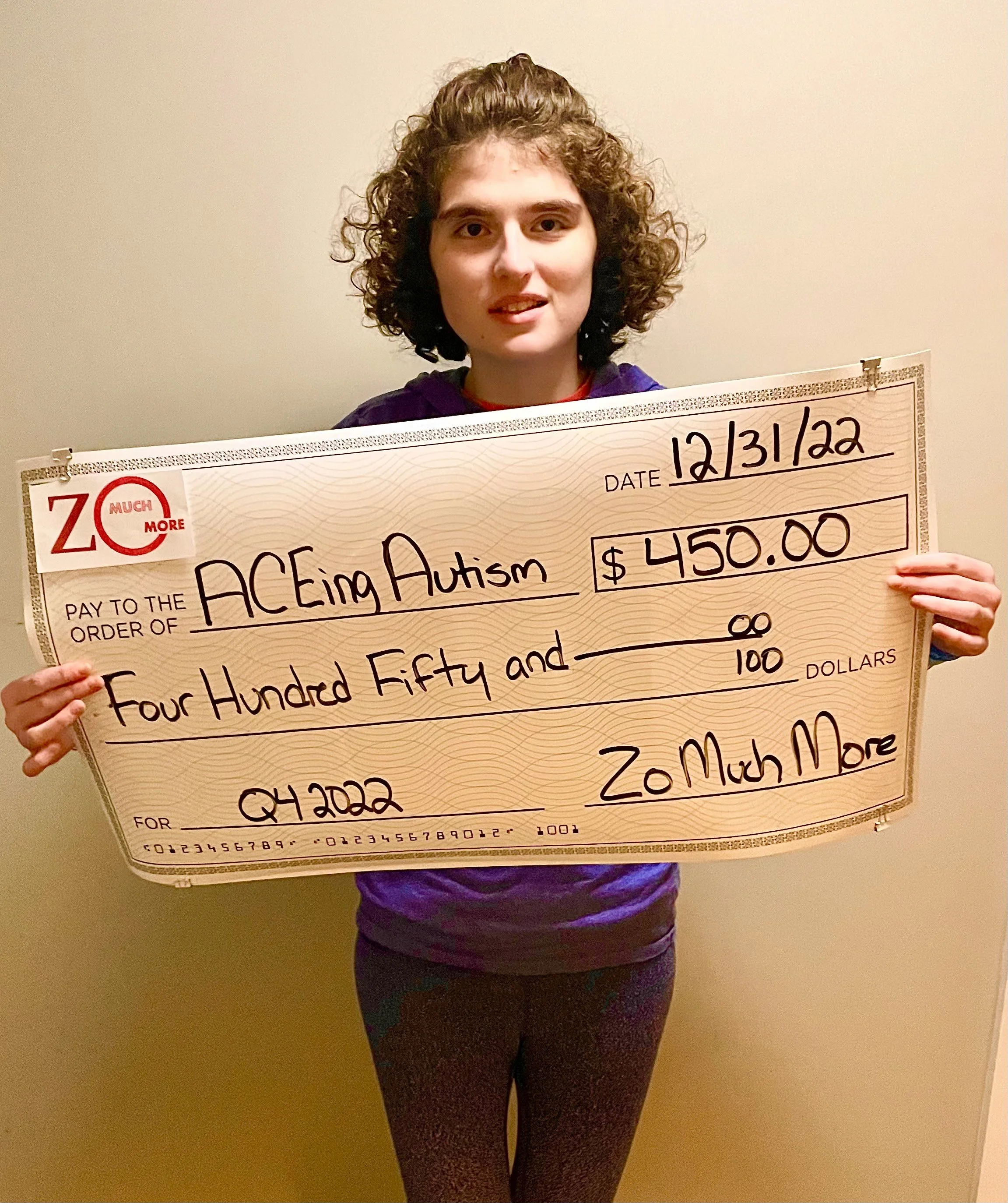 Zo Much More donates 20% of our topline revenue to organizations who share our passion for improving the quality of life for adults on the autism spectrum - and often other ages/disabilities as well. We choose a different organization to feature periodically and at the end of the timeframe, Zo Much More makes the donation. For 2025, we will be dividing our donation equally among our 4 current charity partners.